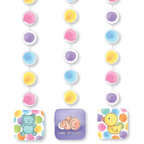 Fancy Hanging Cutouts hang about 3 down and have 7 medallions at the bottom Each string has 4 colorful dot cutouts and each medallion features a different image from the Baby Me design 3 per package Read More..