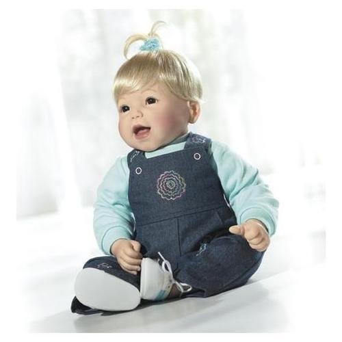 Smiling Jordan will lighten anyones mood In denim overalls with embroidered detail a long-sleeve mint green sweatshirt shoes and matching scrunchy in her hair This baby has light skin blonde hair and brown eyes Vinyl 14-length hands and feet with soft stuffed body 20 Read More..
