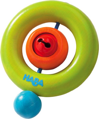 This colorful clutching toy features green blue and orange wooden parts threaded on a blue elastic band but it also holds a little secret Nestled inside the orange wooden ball is a small red bell that offers up a delightful tinkle thats pleasing to babies and adults Great for teething and keep Read More..