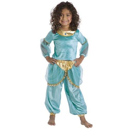 A cute Arabian Princess costume for your little girl from Little Adventures This adorable costume with its bold teal color and gold accentshas a true Middle Eastern flavor The velvet bodice has full sleeves accented with sheer fabric along with a gem at the neckline for that royal look The pant Read More..